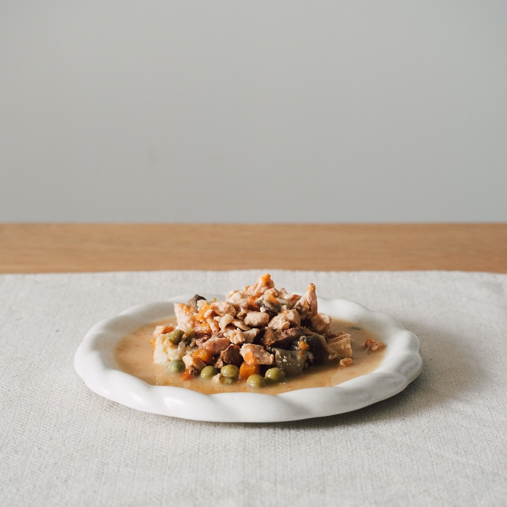 成分:雞肉、雞肝、山藥、袖珍菇、紅蘿蔔、青豆、雞湯。